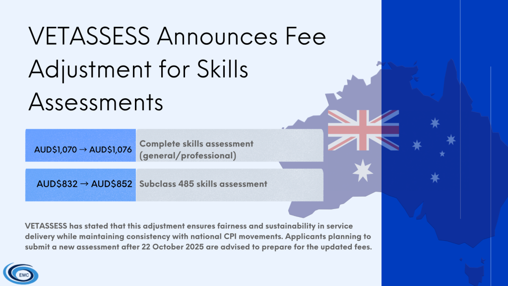 The leading skills assessment body in Australia, Vetassess, states that starting October 22, 2025 the fees for getting a skills assessment for professional and general jobs will increase. The fees are being adjusted to accommodate the inflation (CPI). Denotes that the set of new applications submitted after the said date are required to pay the higher fee.